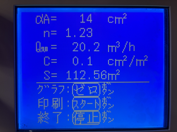 さて、気密測定の結果は、3回続けてC値0.1(平均値は0.133)で最高値は